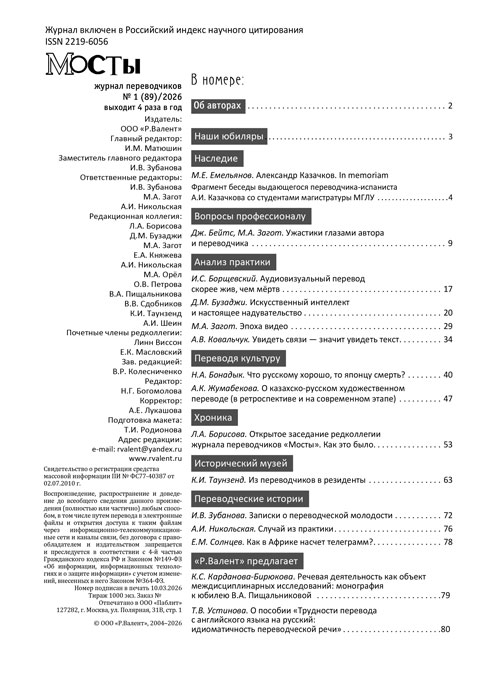 Журнал переводчиков Мосты 1 (89) 2026НаследиеМ.Е. Емельянов. Александр Казачков. In memoriam Статья посвящается памяти замечательного переводчика-испаниста Александра Израилевича Казачкова. Вопросы профессионалуДж. Бейтс, М.А. Загот. Ужастики глазами автора и переводчика C. 9-16 Необычный формат перекрестного интервью, из которого можно узнать и о работе переводчика, и о работе писателя, в том числе и о его отношении к переводчикам. Анализ практикиИ.С. Борщевский. Аудиовизуальный перевод скорее жив, чем мёртв С. 17-19 Прошло несколько десятилетий. Забыты VHS, PAL/SECAM и видеосалоны. На смену пришли стриминговые платформы, торренты и аудиовизуальный перевод как отдельный и очень популярный вид профессионального перевода. В своей статье Иван Борщевский представляет краткий анализ современного состояния АВП на фоне стремительного развития искусственного интеллекта и сложной геополитической обстановки. Д.М. Бузаджи. Искусственный интеллект и настоящее надувательство С. 20-28 В статье автор пытается разобраться с тем, что на самом деле представляет собой генеративный ИИ, включающий большие языковые модели, и ставит самые острые вопросы, возникающие у переводчиков и преподавателей языка и перевода в связи с бурным распространением ИИ во всех сферах жизни. Примеры из собственной переводческой и преподавательской практики, которые приводит автор статьи, дают богатую пищу для размышлений, а выводы вряд ли оставят кого-то равнодушным. Надеемся, что текст Д.М. Бузаджи вызовет большой интерес у наших читателей, как и другие материалы предстоящего номера, подготовка которого идет полным ходом. М.А. Загот. Эпоха видео С. 29-33 А.В. Ковальчук. Увидеть связи — значит увидеть текст С. 34-39 В статье предлагается взглянуть на текст как на систему нелинейных парадигматических связей, где проявленное многообразие языковых форм является на самом деле позиционными вариантами ключевой, текстообращующей идеи. Переводя культуруН.А. Бонадык. Что русскому хорошо, то японцу смерть? С. 40-46 В данной статье автор приводит классификацию стратегий передачи оценочных значений, основанную на анализе переводов художественных текстов, написанных на английском, русском и японском языках. Особое внимание в работе уделяется характеристики культурно-детерминированных факторов, влияющих на выбор одной из стратегий. А.К. Жумабекова. О казахско-русском художественном переводе (в ретроспективе и на современном этапе) С. 47 ХроникаЛ.А. Борисова. Открытое заседание редколлегии журнала переводчиков «Мосты». Как это было С. 53 Исторический музейК.И. Таунзенд. Из переводчиков в резиденты С. 63 В статье рассказывается история профессиональной метаморфозы переводчика Посольского приказа Ивана Афанасьева в русского резидента в Лондоне в 1722–1727 гг. Во многом уникальная судьба одного человека разворачивается на фоне захватывающих событий в России и в мире. Однако сквозь эту уникальность можно рассмотреть те аспекты профессии переводчика, которые во все времена позволяли ему адаптировать свои знания, умения и таланты для решения самых разных профессиональных задач. Переводческие историиИ.В. Зубанова. Записки о переводческой молодости С. 72 А.И. Никольская. Случай из практики С. 76 Е.М. Солнцев. Как в Африке насчет телеграмм? С. 78 «Р.Валент» предлагаетК.С. Карданова-Бирюкова. Речевая деятельность 